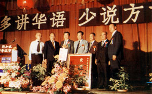 马来西亚五个河婆同乡会联合赠送镶着镜框的纪念锦旗予新加坡河婆同乡联谊社筹委会。