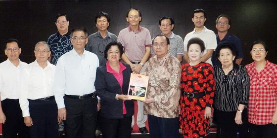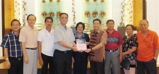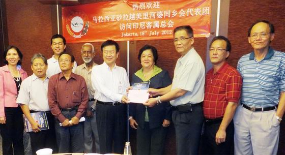 | 拜访印尼客属联谊会总会,受到热烈欢迎。温素华会长移交请柬予总务陈国财(右四)。 |