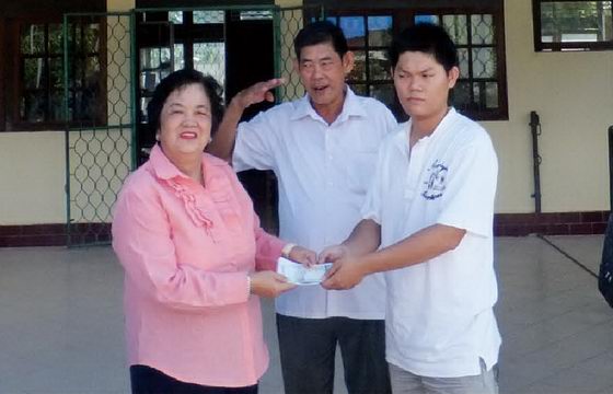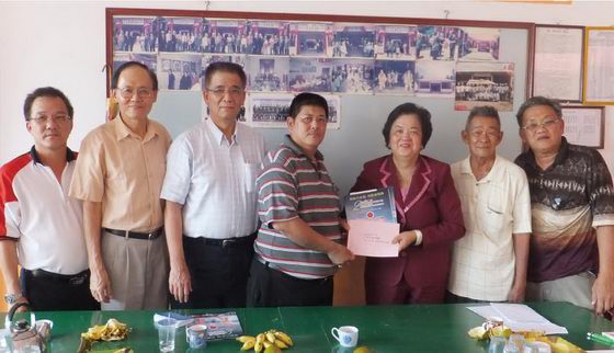 | 河总会长温素华(左)捐六百万印尼盾(约合马币2千元)予印尼坤甸松柏坡的太原学校充作办学经费,由中文部老师温世忠接领。中立者为该校中文部监督温顺意。 |