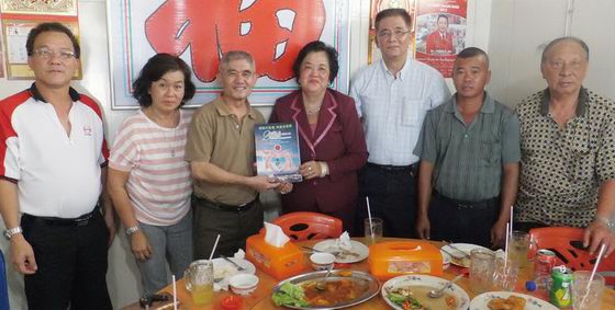 | 坤甸温氏宗亲会理事假酒楼设宴招待工委会一行人。图为工委会主席张庆发移