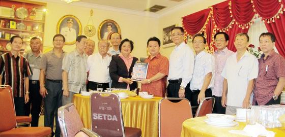 金会的理事们冒着生命的危险来链接已断层的华教,崇高的精神,令人非常感动。图为河总会长温素华移交世河请柬予方劲雄主席(左五)。 |