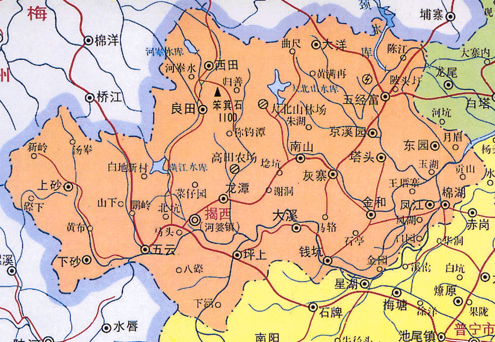 钱坑镇 钱坑镇位于县境东南部,东接金和镇,西以金山为分水岭,南与普宁石牌、大池农场接壤,西北与大溪镇分界,东南与普宁鲤湖镇毗邻。距县城25公里。面积47.75平方公里,人口3.77万。辖1个居民委员会,13个管理区,65个村民小组。